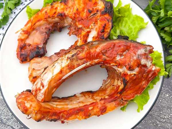 Выложить рыбу на решетку мангала (можно использовать закрытую решетку). Готовить буквально пару минут или до лёгкого румянца.