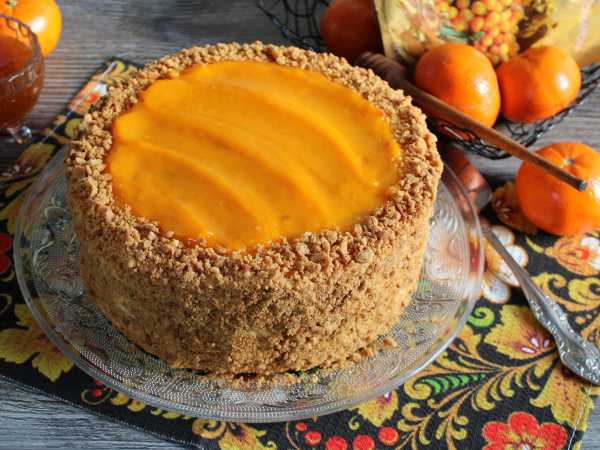 Дайте коржам остыть, они тонкие, поэтому времени много не понадобится. Разметьте крем на шесть частей-секторов и соберите торт, промазывая коржи. Удобно это делать в разъемном кольце. Придавливаете каждый корж, прежде чем смазать его кремом чиз. Выступившим кремом обмажьте бока торта.