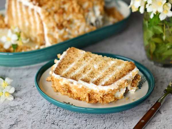 Дайте торту схватиться в течение около часа в холодильнике. Затем аккуратно высвободите его из кольца и обсыпьте крошкой (из подсушенных измельченных обрезков медовых коржей).