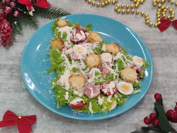 Подавайте в ближайшее время! Но так-то салат может постоять в холодильнике, например, за шесть часов он никак не ухудшится. Ароматные сухарики предлагайте отдельно, пусть каждый добавляет их в свои порции. Между нами… Есть любители уложить сухарики сразу в салат и даже самым нижним слоем при подаче. Не все же гонятся за хрустящими, кто-то предпочитает пропитанные соками.