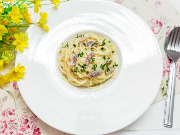 Для этого рецепта можно использовать: спагетти, тальятелле, лингвини, фетучини или капеллини. Я свой выбор остановила на пасте букатини. Пусть вас не пугают все названия. В Италии, на родине пасты, насчитывается более 100 видов макаронных изделий, все они имеют свое название, форму и размеры.