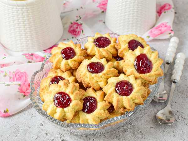 Отсадите из кондитерского мешка или выложите чайной ложечкой на каждую печеньку джем по вкусу и подавайте готовое печенье к столу.