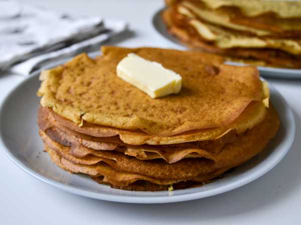 Разогрейте блинную сковороду и смажьте ее в первый раз маслом. Влейте часть теста и округлите, испеките блин по 1-2 минуты с каждой стороны. Если края блина будут подгорать, а серединка - оставаться сыроватой, то просто убавьте нагрев.