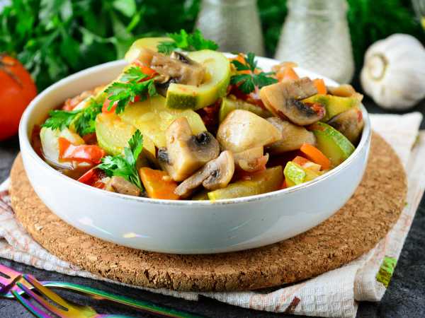 Продолжайте обжаривать овощи, пока грибы не пустят сок и он не выпарится.