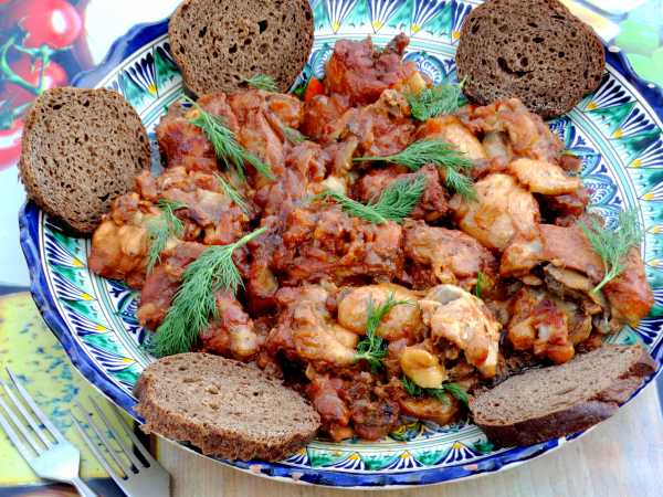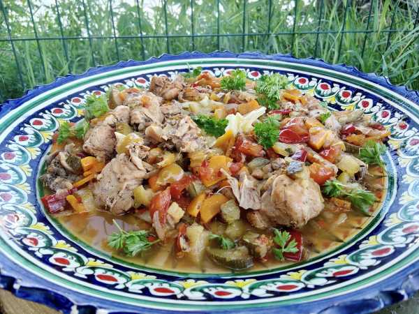 Затем казан с овощами снимите с огня. На морковь и лук выложите куриные части.