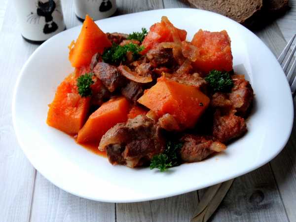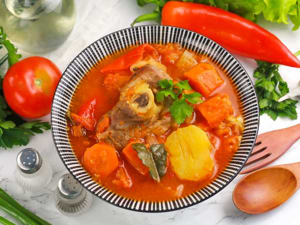 Закройте крышкой и продолжайте тушить на среднем или слабом кипении. К мясному бульону добавятся соки овощей - это особенно вкусно. Примерно через полчаса проверьте, сварилась ли картошка и легко ли отходит мясо от костей. Если нет, то тушите ещё на слабом огне.