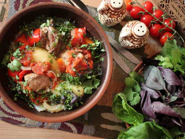Извлеките мясо из казана на блюдо, срежьте его с костей. Подавайте чанахи в глубоких порционных тарелках, сопроводите свежей рубленой зеленью. Предложите соль и молотые перцы.
