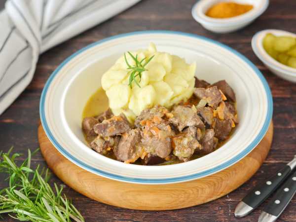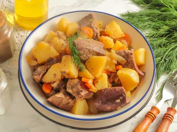 Выложите свиную печень с картошкой из мультиварки на тарелки и подайте к столу горячей. Не забудьте про сметану, майонез, различные соусы.