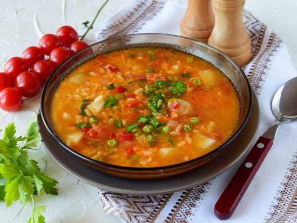 Варите овощи до полуготовности. Рис промойте и добавьте в суп. Посолите и поперчите по вкусу. Варите до готовности всех ингредиентов.