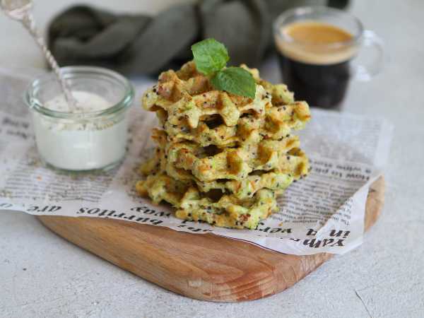 Разогрейте вафельницу, панели смажьте маслом. Выложите тесто по 1.5-2 ст.л. и выпекайте сладкие вафли из кабачка в вафельнице примерно по 3-4 минуты, до приятного золотистого цвета. Если нет вафельницы, то выпекаем вафли на сковороде, предварительно смазанной растительным маслом.