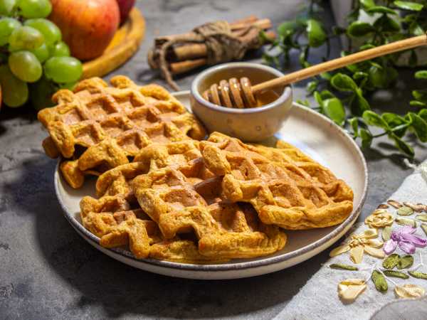 Подаем сладкие кабачковые вафли с топингом или любимым джемом. Я подавала с абрикосовым джемом без сахара.
