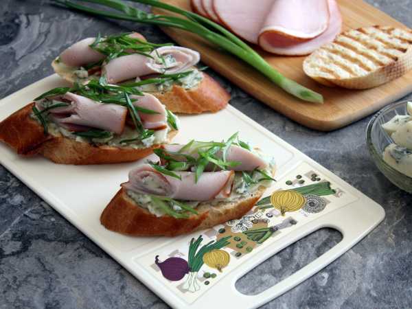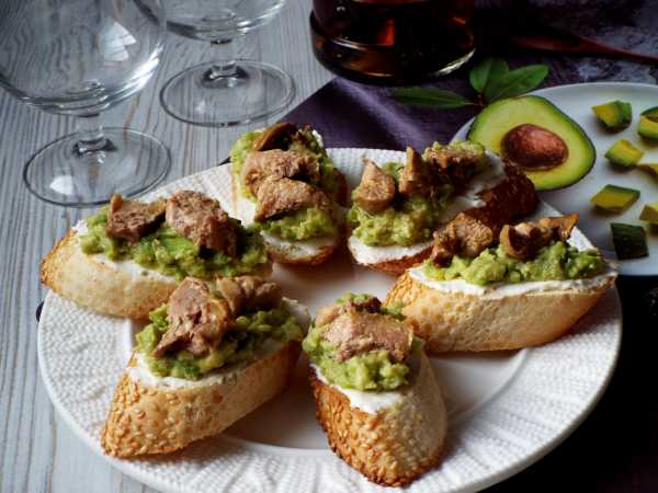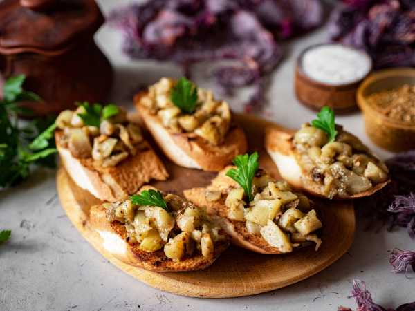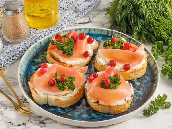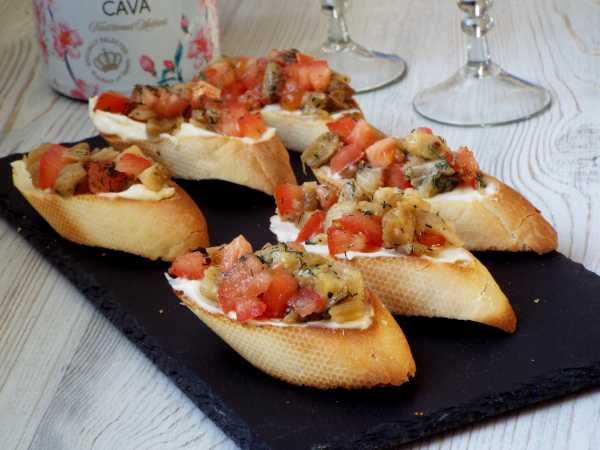 Ломтики багета или батона выложите в чашу аэрогриля, в форму духовки и запеките 4-6 минут при 180 градусах. Помните, что при приготовлении в духовке ее сначала нужно хорошенько разогреть. Также ломтики багета можно обжарить на растительном масле на сковороде по 1-2 минуты с каждой стороны. Затем обязательно остудите хлебную основу в течение 5-10 минут.