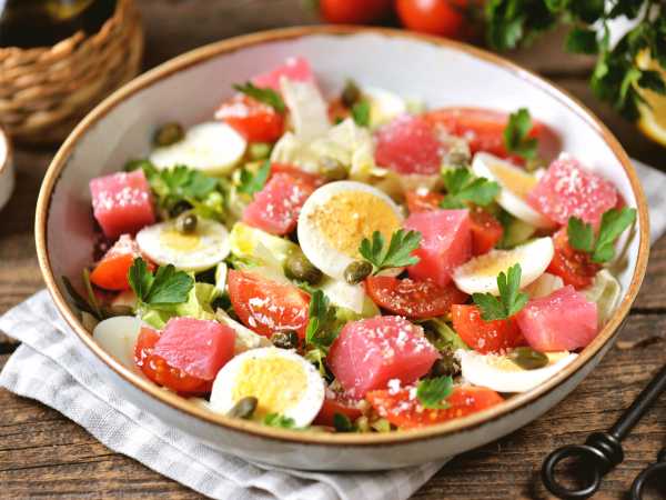 Промойте листочки салата и стряхните лишнюю влагу. Нарвите их руками и выложите на майонез.