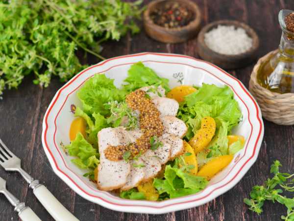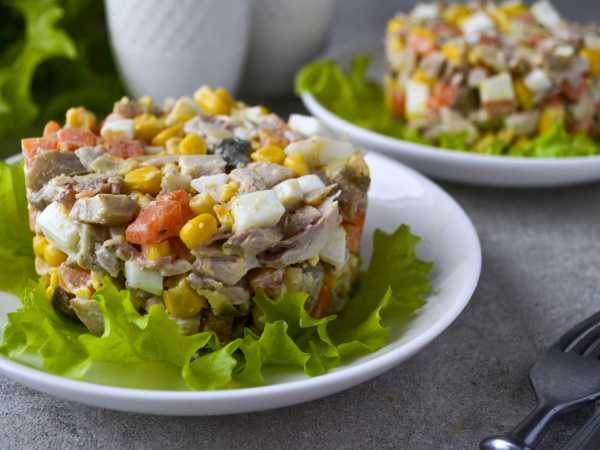 Салат немного посолите, учитывая что маслины, кукуруза и горошек уже содержат соль. Поперчите по вкусу и заправьте майонезом.