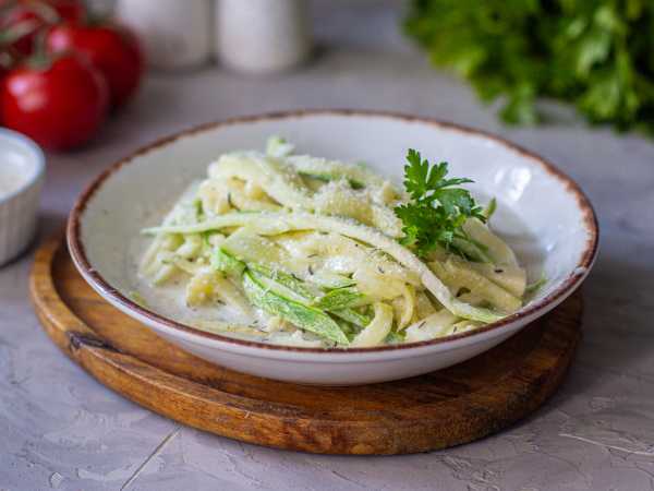 Аккуратно перемешайте, продолжайте готовить еще 1-2 минуты. Спагетти из кабачков с творожным сыром готовы.