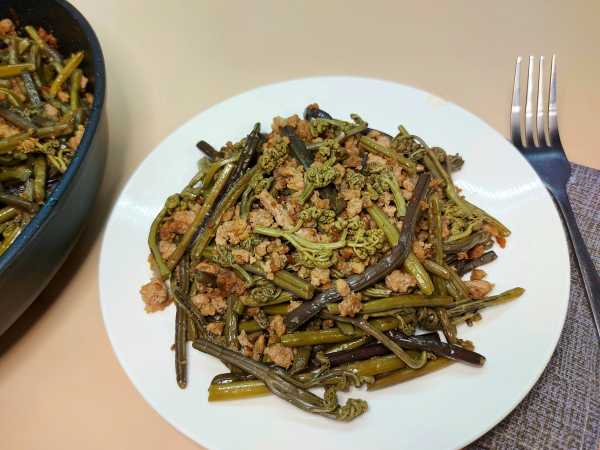 Овощи нарежьте соломкой. Папоротник у меня соленый, его предварительно обязательно вымачиваем в холодной воде, каждые полчаса меняя воду. Время вымачивания может занимать от 3 часов и более, поэтому я обычно вымачиваю папоротник накануне днем.