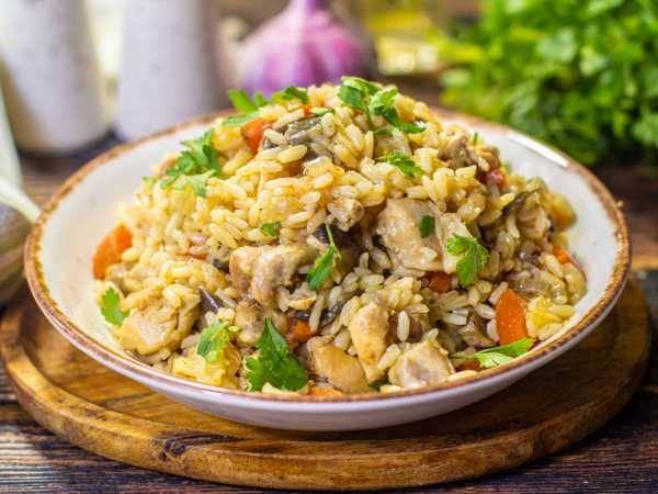 Собираем блюдо. Поскольку пибимпаб перемешивается уже непосредственно перед употреблением, уместно подавать блюдо в глубокой тарелке. На дно уложите порцию отварного риса, чуть сбрызнув его кунжутным маслом.