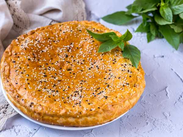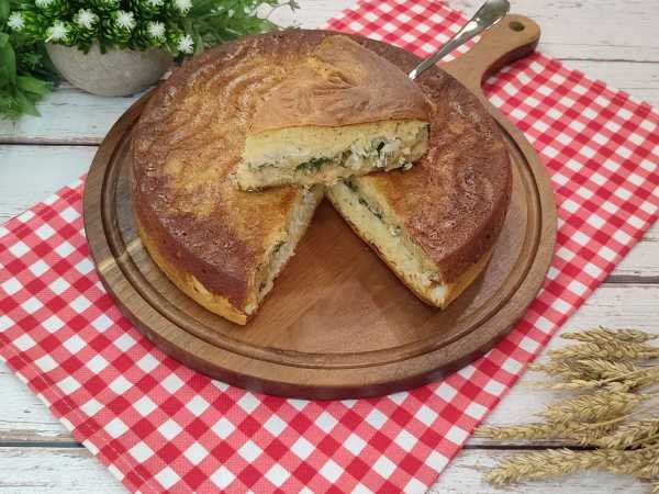 Пеките пирог в духовке, разогретой до 175-180 градусов, 40-45 минут. Время выпекания и температурный режим зависят от вашей духовки.