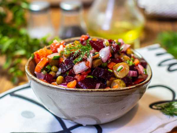 Заправьте винегрет растительным маслом, посолите, поперчите и перемешайте.