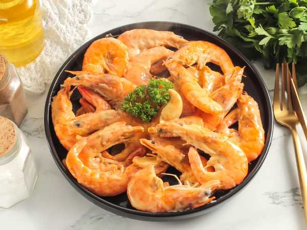 У меня были серые, очищенные от черной жилки и панциря, хвостики уже сама убрала. Разморозила их, перемешала с половинкой тёртого чеснока и лимонным соком, чуток посолила и сбрызнула оливковым маслом. Запекла их в духовке при 200 градусах за 8 минут.