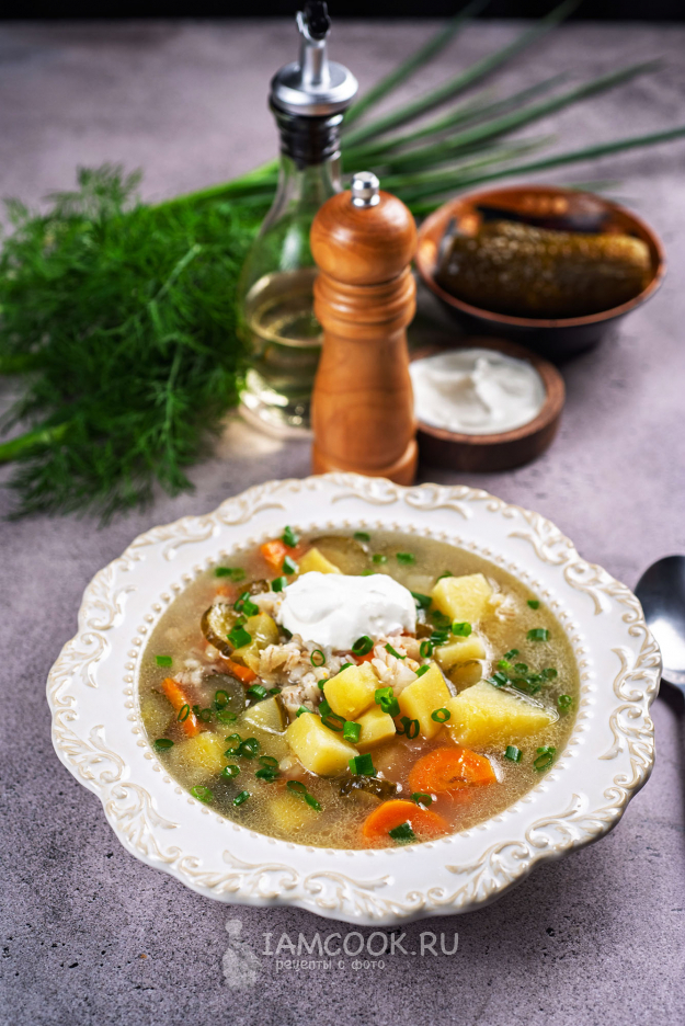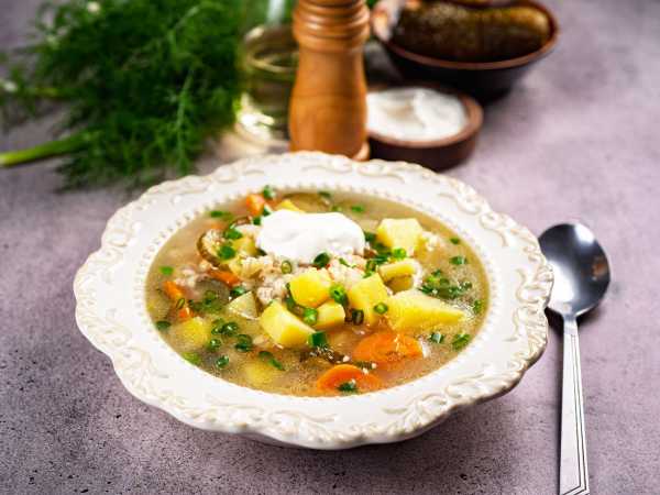 Выложите горячий рассольник в порционные тарелки, присыпьте мелко порубленным зеленым луком и подавайте к столу со сметаной. Приятного аппетита!
