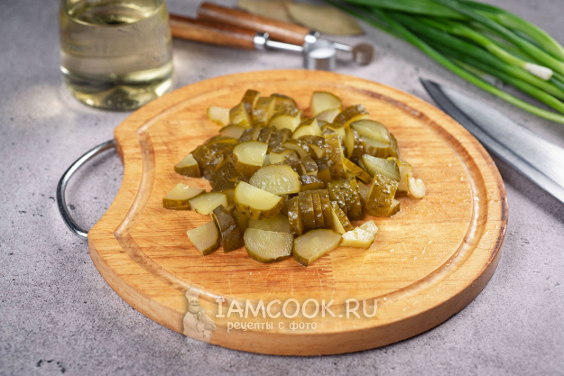 Затем казан снимите с плиты и выложите к обжаренным овощам все остальные ингредиенты: куриные части (у меня крылышки), промытую перловку, картофель, огурцы, залейте рассол, воду, добавьте соль, перец, лавровый лист.