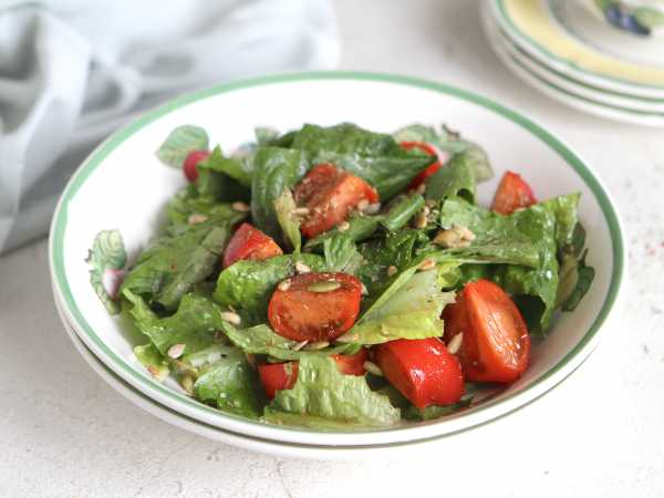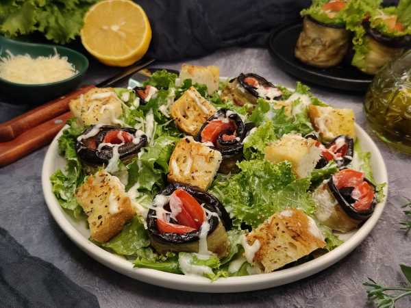 Подготовьте листья салата романо. Заправьте их готовым соусом (4-5 ст.л.), остатки соуса уберите в холодильник - его можно использовать для заправки других салатов.