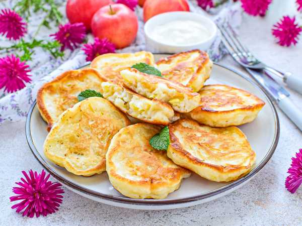 Оладьи из яблок и кабачков на кефире готовы. Подавайте их со сметаной, вареньем, медом.
