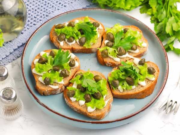 Любой хлеб: багет, батон, тостовый нарежьте на одинаковые кусочки. У меня домашний хлеб на закваске с семенами льна, пекла я его вот по этому рецепту.