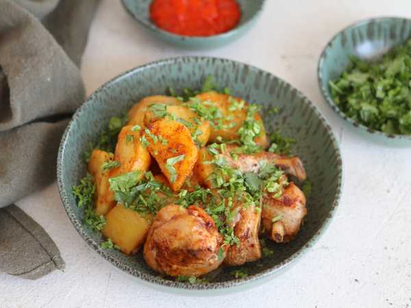 Запекайте куриные плечики с картошкой в духовке 50 минут, затем снимите фольгу и допеките блюдо 10-15 минут, до румяности, время от времени его перемешивая.