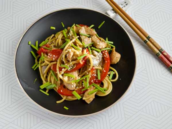 Перемешайте лапшу с мясом и овощами, прогрейте все вместе пару минут. Попробуйте, при необходимости добавьте соли.