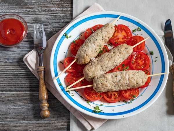 Разделите фарш на равные части и скатайте их в руках в колобки. Насадите сначала на шампур кружок баклажана, затем колобок фарша и т.д. Последним должен быть баклажан. Слегка прижмите конструкцию, чтобы фарш не выпадал. Сбрызните растительным маслом.