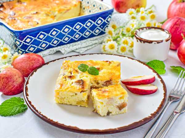 Переложите творожную массу с яблоками в форму для выпекания и установите в чашу аэрогриля. Установите время приготовления - 40 минут. Температура - 170 градусов. Готовьте творожную запеканку с яблоком в аэрогриле до окончания программы. Готовность можно проверить деревянной шпажкой, она должна выйти абсолютно сухой из середины запеканки.