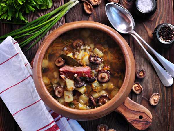 Вливаем воду (густоту супа регулируйте количеством воды по своему усмотрению), даем закипеть, добавляем морковь, промытую крупу. Варим до полной готовности всех ингредиентов, не забыв приправить по вкусу солью, перцем.