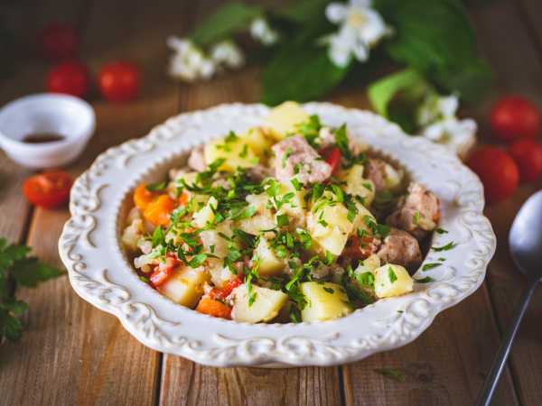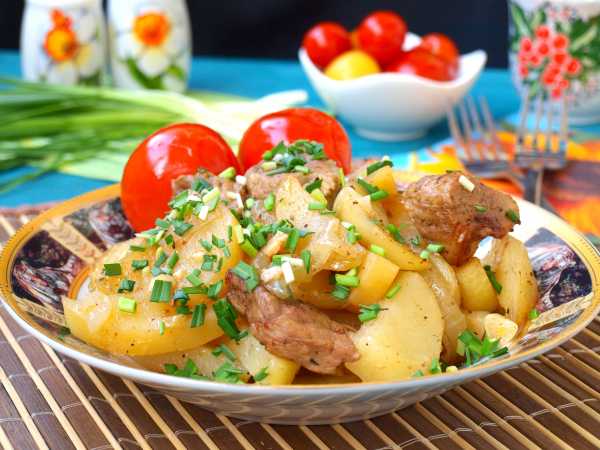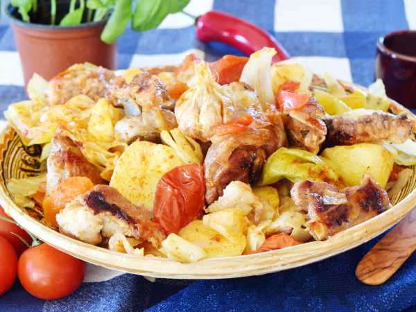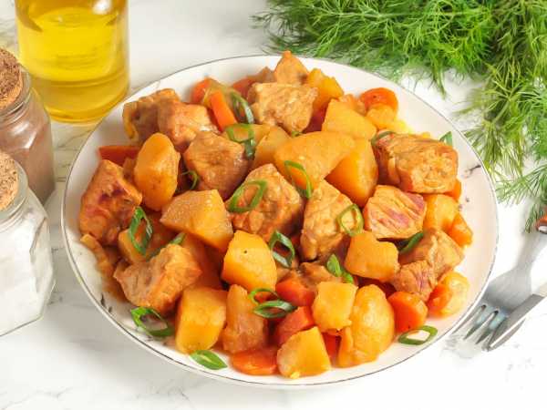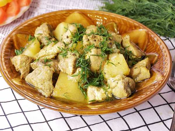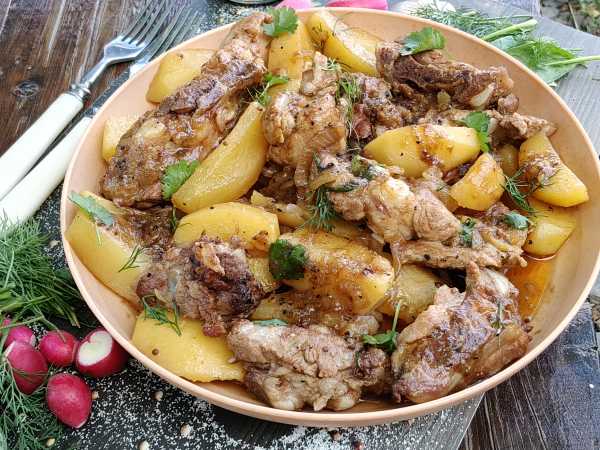 Казан-кебаб из свинины готов. Подаём его к столу в горячем виде, со свежими овощами и зеленью. Приятного аппетита!