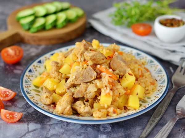 Перекладываем картошку обратно в казан с мясом, добавляем воду, солим по вкусу и доводим до кипения. После закипания накрываем казан крышкой и тушим на медленном огне около часа.