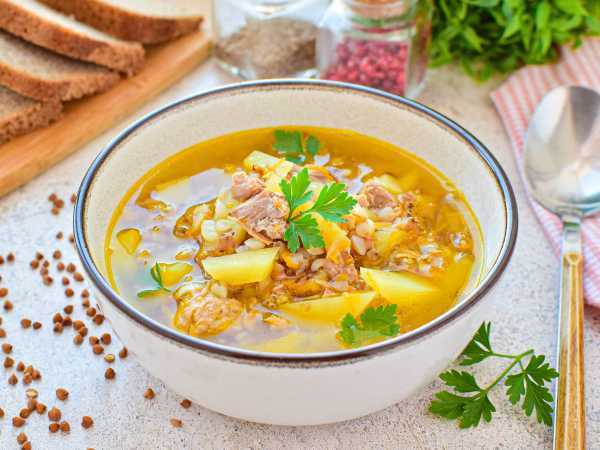 Гречку, если нужно, переберите и хорошо промойте в воде. Добавьте в кастрюлю с картошкой. Посолите по вкусу.