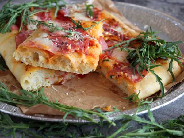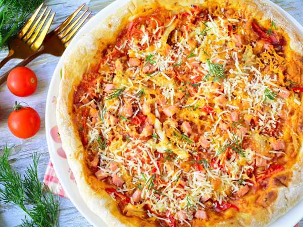 Пока основа готовится, нарежьте тонкими кружочками помидоры, колбасу.