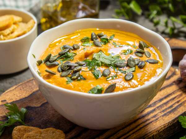 Подать тыквенный суп к столу в тыкве. Можно разлить его по чашкам, а потом сам горшочек разрезать на кусочки и подать с супом. Приятного аппетита!