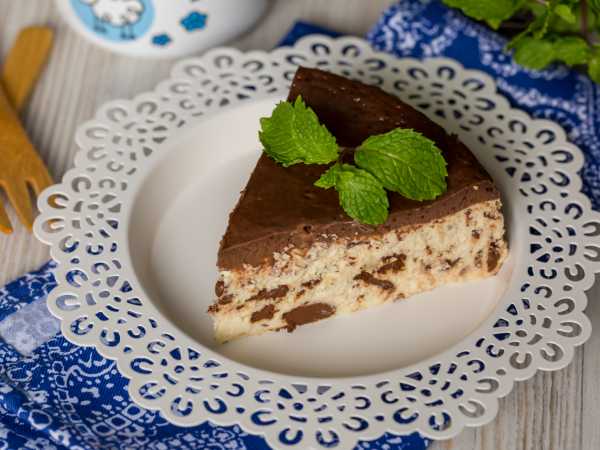 Готовая творожная запеканка с шоколадом и бананом должна хорошо держать форму, быть плотненькой, иметь румяную верхнюю корочку.