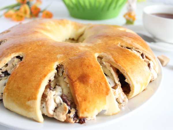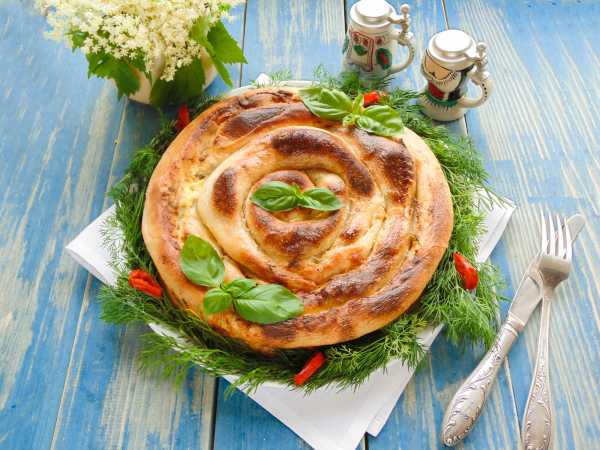Подошедшее тесто достаньте из миски и обомните. Затем раскатайте в прямоугольный пласт. На край пласта выложите начинку и накройте тестом, залепите края, как на фото.
