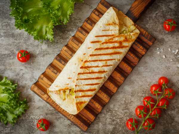 Бургер из тортильи с фаршем можно быстро подсушить на сковороде.