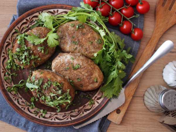 Разделить фарш на 4 части, скатать шары, выложить на противень и в центре сделать углубление.