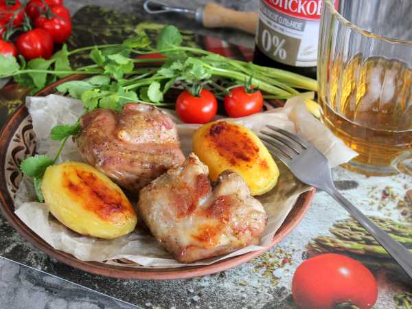В зависимости от веса продукта время запекания может меняться. Вес ножек в моем случае составил 635 г. Первые 15 минут запекала ножки при 190 градусах. Затем снизила температуру до 160 градусов и запекала ножки еще 85 минут, периодически поливая ножки и дольки картофеля оставшимся соусом и жидкостью из формы. Режим - конвекция верх/низ.