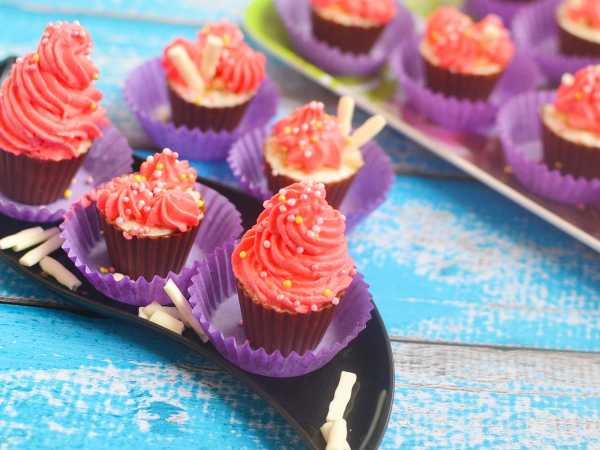 Разольём смесь по формам, не доходя до бортика формы как минимум 1 см. Если используются орехи или топпинги для выпечки, то посыплем ими поверхность.