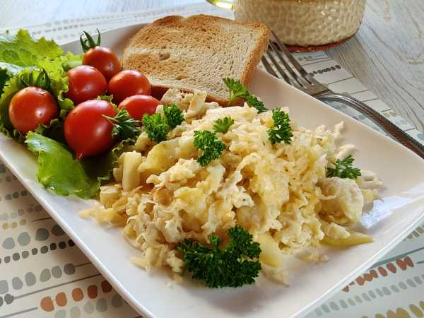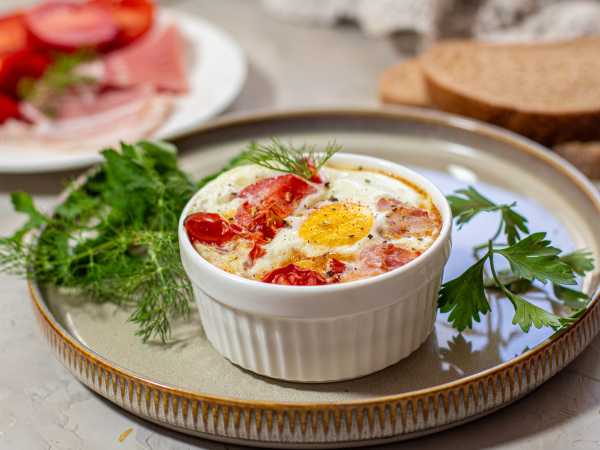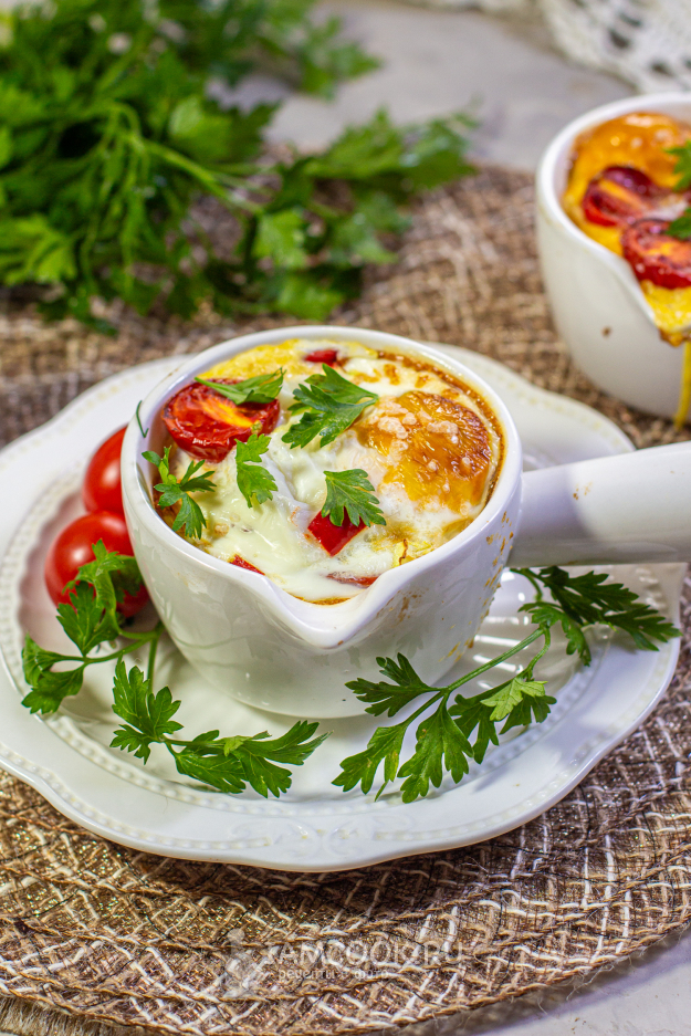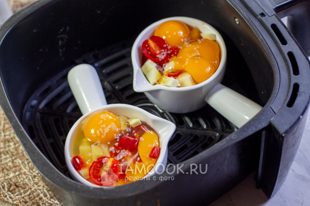 Готовую яичницу с овощами посыпьте измельчённой зеленью. Порционная яичница с овощами, запеченная в аэрогриле, готова. Приятного аппетита!