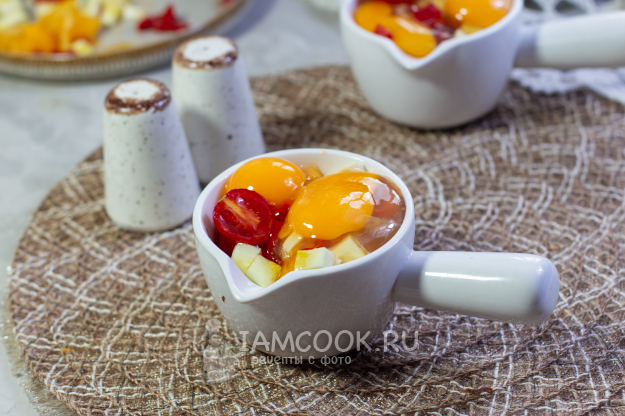 Разбейте в каждую форму по два куриных яйца. Посолите и поперчите по вкусу.