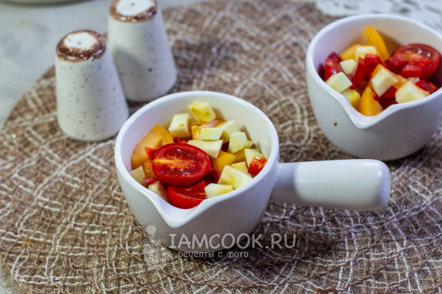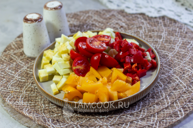 Кабачок, сладкий перец и помидор помойте, обсушите и нарежьте небольшим кубиком. Помидорки черри нарежьте на две или четыре части.