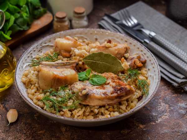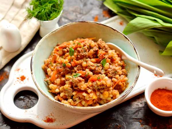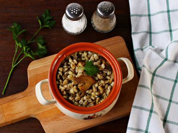 Пакетик с перловкой переложила в сотейник, залила водой. Довела до кипения, убавила огонь и варила 45 минут. Далее переложила перловку в форму для запекания, сбрызнула 2 ст. л. растительного масла и отправила в духовку на 25 минут.