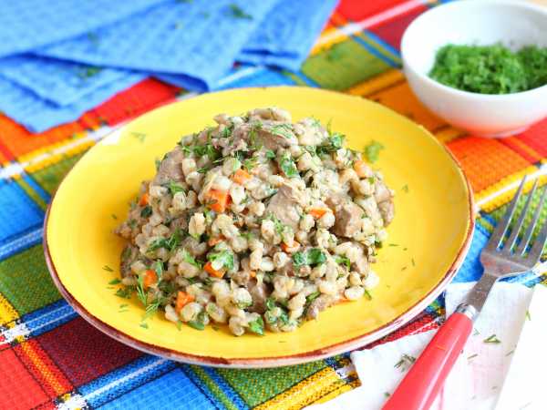 Перловка с куриной печенью в духовке готова. Разложите по тарелкам и подавайте к столу.